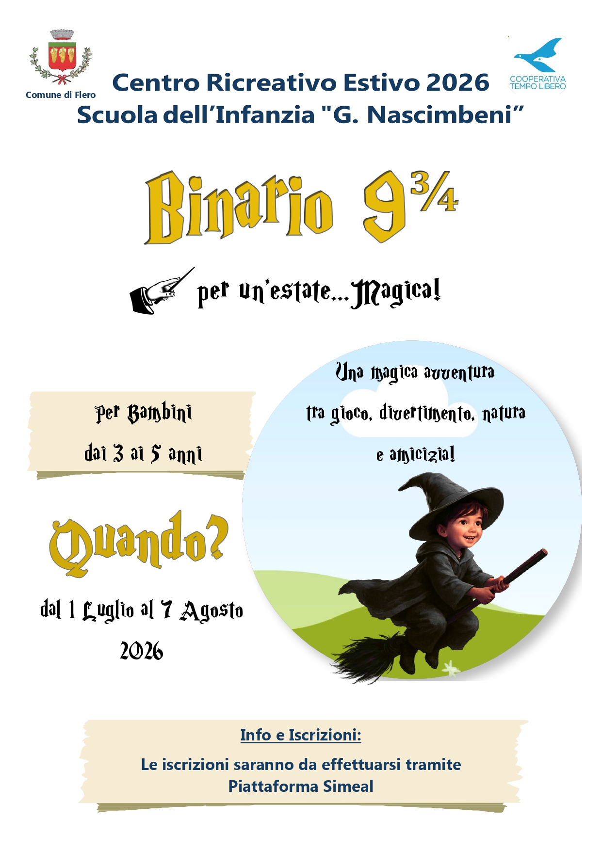 Si avvisa che lunedì 27 aprile 2026 apre il bando per l’iscrizione al CRE (Centro Ricreativo Estivo) 2026 presso la Scuola dell’Infanzia Comunale paritaria “G. Nascimbeni” in Via Paine n.10.