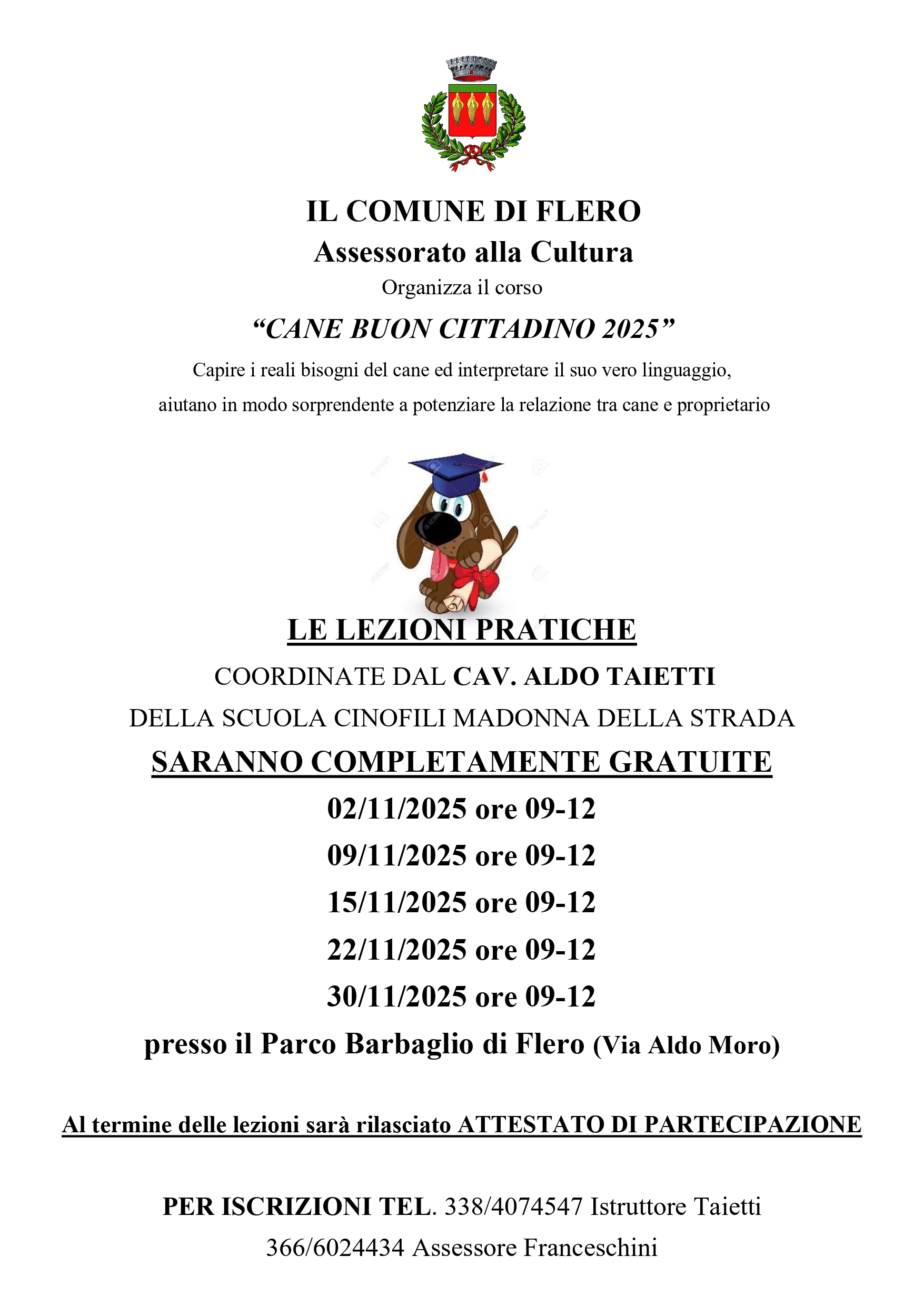 L'assessorato alla Cultura organizza il corso "CANE BUON CITTADINO"