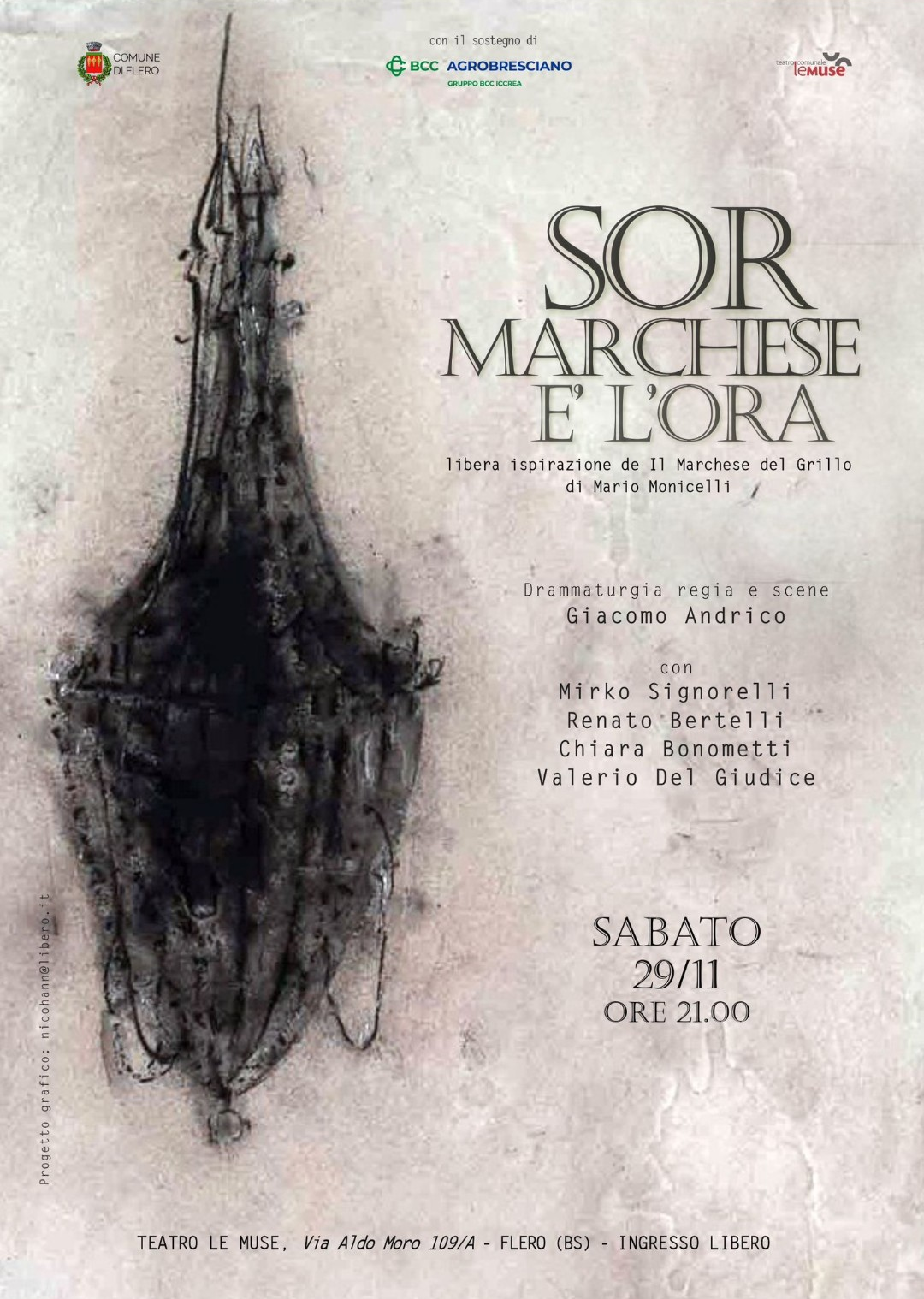 Libero adattamento de Il Marchese del Grillo. Il regista Giacomo Andrico mette in scena "Sor Marchese è l’ora" con l’intento di narrare in chiave comico-grottesca l’incontro e lo scontro tra l'immagine di Roma città eterna e la visione rivoluzionaria di Napoleone I Bonaparte. In mezzo a questa disputa, troviamo il saggio e ironico Marchese Onofrio del Grillo, magistralmente interpretato da Mirko Signorelli. Ad affiancarlo Renato Bertelli, che compone anche le musiche, Chiara Bonometti e Valerio del Giudice.